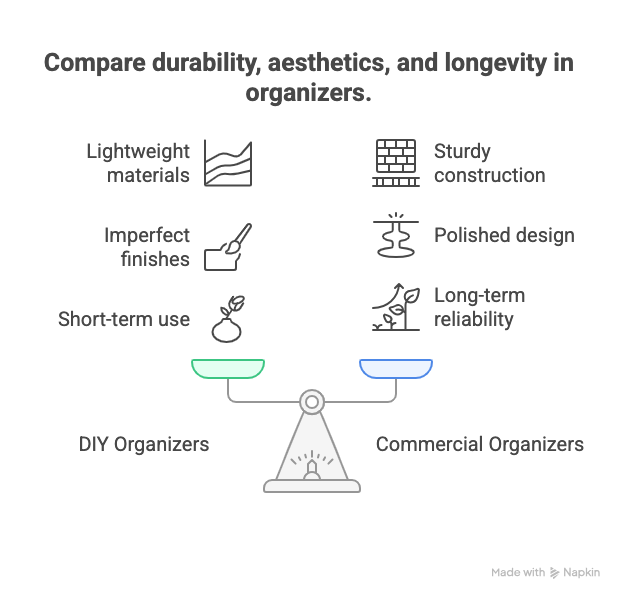 Commercial options are designed to blend seamlessly with your home’s decor. They offer clean lines, uniform colors, and professional finishes that are tough to replicate with DIY methods. If you care about aesthetics as much as function, a store-bought organizer often wins hands down.